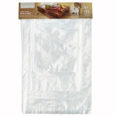 Lakeland Pick-a-Bags are stored on a handy header, ready to store in a cuboard or on the Lakeland Pick-a-Bag Holder; you can quicky see the size you need and pull it off. Great quality, these flat, freezer-safe food bags are 120 gauge for strength and greater protection from freezer burn and are sealed at the bottom to prevent splitting, Pack of 125 bags in 3 sizes.50 x size 3 (18 x 23cm), 50 x size 4 (20 x 30cm), 25 x size 6 (28 x 41cm) Read more details..